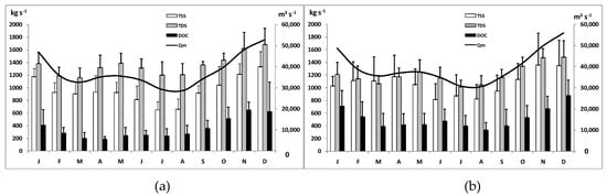 The annual variation of interannual monthly fluxes of total suspended sediment (TSS), total dissolved solid (TDS) and dissolved organic carbon (DOC) at the Congo River outlet, related to the interannual monthly discharge (Qm), from (a) 1987–1993, and (b) 2006–2017.