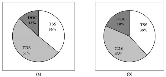 Percentage contribution in fluxes of total suspended sediment (TSS), total dissolved solid (TDS), and dissolved organic carbon (DOC) of the total matter fluxes transported by the Congo River at its mouth outlet for: (a) the 1987–1993 period, and (b) the 2006–2017 period.
