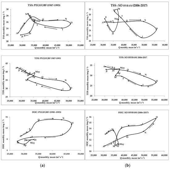 The concentrations versus discharges at a monthly time step described a classical C–Q hysteresis; this could be used as a descriptor of biogeochemical behavior of the river basin [,,]. For the two periods, TSS, TDS and DOC monthly concentrations at the Congo River Outlet show a classic double hysteresis, linked to its bimodal river regime related to the hydrological cycle of the river which begins at the end of August (Figure 8). For all the variables, the main hysteresis takes place from November to January, during the main flood of the river, and the second from March to June during the second small peak flow in the spring period.