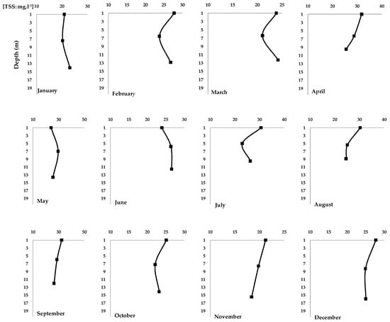 Spatial and temporal distribution of mean monthly TSS concentration (during the period January 2013–December 2017) at three point of the water column (Surface, Middle, Bottom). On the x-axis are the TSS concentrations (mg L−1) and on the y-axis the depth (m).