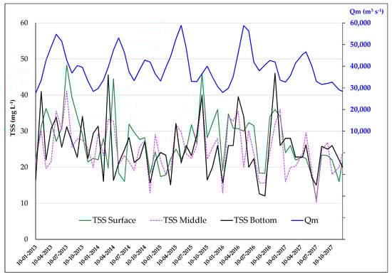 As the TSS concentrations of the three sampling depths vary concomitantly (Figure 11), it is now possible, thanks to satellite remote sensing (Landsat 8 OLI and MODIS sensors), to evaluate the TSS concentration of the Congo waters, as was successfully carried out on the Orinoco, Amazon and Guyanese rivers [,,,]. The colorimetry of waters makes it possible to link their reflectance to their surface TSS concentration. In addition, the regression of Figure 10 makes it possible to estimate the average TSS concentration in the measuring section of the Congo River. Then, using the daily flows of the day of sampling, a TSS flow is obtained.