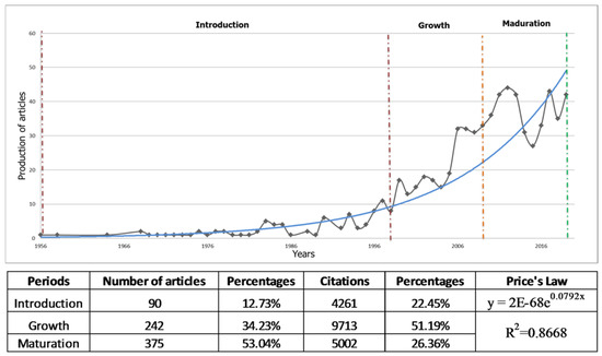 The analysis of the results of the advanced search after cleaning the data of the geological term called “volcanic geomorphology”, indicates that the study of this line of research has resulted in a total of 707 documents produced from 1956 to 2019, the same ones that for analysis purposes we have divided into three time periods, such as introduction (1956–1998), growth (1999–2009), and maturity (2010–2019). Likewise, the analysis of productivity has been proposed of a field of study using Price’s law, which has served to evaluate the increase in production, adjusting to exponential growth [54]. Obtaining, as a result, the equation y = 2E−68e0.0792x, where the value of R2 (coefficient of determination) is 0.86, revealing the quality of the representative power of the function, therefore, we can say that the research on “volcanic geomorphology”. It is in the phase of exponential growth, which guarantees that it is a growing research field (see Figure 2)