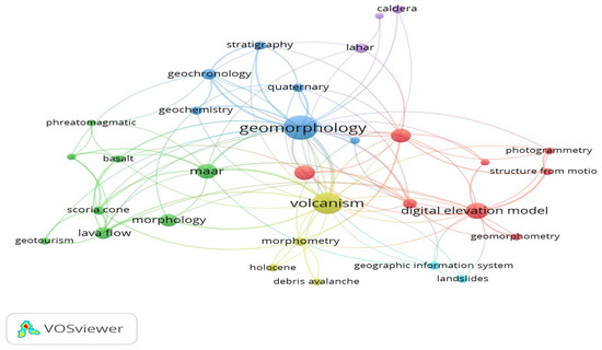 Others, smaller clusters are: Cluster 2 (green) “Volcanic Products”, made up of eight nodes and 92 co-occurrences, showing studies related to the types of geological materials [91] that have arisen as a product of volcanic processes [14]; where the keywords that stand out are: “maar”, “lava flow”, “scoria cone”. Cluster 4 (yellow) “Volcanism” consists of four nodes and presents 75 co-occurrences. In this cluster, the studies are focused on volcanism [92], knowledge and detection of land relief modifications [93] and the conformation of new geological structures through geotechnical processes [94]; where the most representative keywords of the cluster are “volcanism” and “morphometry”. Cluster 5 (purple) “Pyroclastic flows” consists of two nodes and 25 co-occurrences, represents studies related to volcanic flows that arise in an eruption [95] and of structures that make up the land relief as a result of geological processes [96].