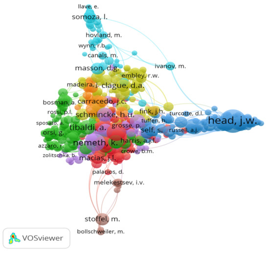 Cluster 1 (red) “Processes and geological effects” made up of 173 authors with 28,887 co-citations whose central theme of the cluster focuses on the evolution of the quaternary landscape through the use of high-resolution remote detection to determine the perception of certain structures, dynamic effects and geological consequences. The featured author is Sparks, R.S., and the University of Cambridge. Cluster 2 (green) “Petrology of volcanic fields” represented by 140 authors with 28,029 citations. The Cluster that mentions the structure and petrology of the various volcanic fields in order to control the intrusion of sheets or other objects within them. The most outstanding researchers were: Tibaldi, A. from the University of Milano—Bicocca and Acocella, V. from Università degli Studi Roma Tre.
