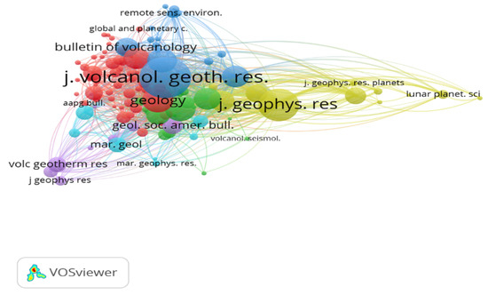 Table S3 shows a diverse and complex co-citation group for journals: Cluster 1 (red) “Earth geological processes” consists of the Geology journals; Geomorphology; Geological Society of America Bulletin and Sedimentology, where the most relevant is “Geology” with H-index 189 considered as the representative journal of the study area for its number of co-citations; In Cluster 2 (green) “Earth and science” shows the journals Earth and Planetary Science Letters (EPSL), Bulletin Volcanology, Tectonophysics and Geophysics; as the most representative; the most relevant of this group is “Earth and Planetary Science Letters (EPSL)” with 215 H-index. Cluster 3 (blue) “Volcanic processes” are made up of the journals Volcanology and Geothermal Research, Journals Geophysics Research and Remote Sensing of Environment as the most representative; where “Journal of Volcanology and Geothermal Research” presents the highest H-index (105). Cluster 4 (yellow) “Geological Nature” presenting the journals Nature, Journal Geophysical Research, Science and Icarus; where the “Journal Geophysical Research” shows the highest H-index of the group.
