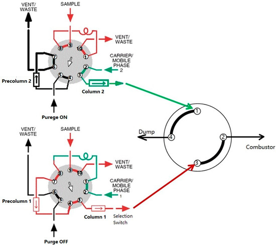 The second fast sampling cycle feature is achieved through automated control of three automated multiport valves, as depicted in Figure 2. First, in the first 10-port, two position valve (VICI Valco, TX), the fastest eluting components such as carbon monoxide and methane are separated from carbon dioxide and C2+, i.e., ethane and heavier hydrocarbons, through precolumn 1, during column 1 injection stage. Then, the first 10-port valve is switched to sample loading mode; during this mode, the sample loop 1 is loaded with new mud gas samples while the fastest eluting carbon monoxide and methane move on and are separated in column 1, and at the same time, CO2 and C2+ trapped in precolumn 1 are purged from the precolumn. Second, in the second 10-port two position valve’s injection mode, eluting components faster than C3 are allowed to pass through precolumn 2, while C4+ are trapped in precolumn 2. Then, in the sample loading mode, sample loop 2 is loaded with new mud gas samples, while the fastest C1~3 compounds elute through column 2, and the C4 and heavier compounds trapped in precolumn 2 are purged out. The third 4-port valve switches the output from the two columns 1 and 2, and allows methane from column 1 and C2 and C3 and ethylene from the column to pass and travel through the combustion tube, eventually to be analyzed. If only analyzing methane, ethane and propane, the cycle could be as short as 100 s, and if CO and CO2 are also needed, the cycle is extended to 120 and 135 s, respectively.