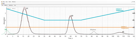 As shown in Figure 3, the temperature of the first column is held at constant 35 °C while the second column has temperature ramps from 70 to 120 °C to optimally separate C2, ethylene and C3, while cutting off CO and methane in the front. The pressures for column 1 and 2 are also varied over the cycle to push out the components that will not be analyzed, while extending the peak of the desired compound to optimal width and signal-to-noise ratios.