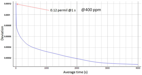 Second, the spectrometer has built in several temperature stabilization schemes to maintain long term stability. Further stability is maintained through periodic calibrations with standard gases. The spectrometer features a small sample volume and therefore could afford fast calibrations with minimal consumption of standard gases. Figure 4 gives the Allan variance of the spectrometer’s isotope ratio standard deviation measured over 4000 s [4,5].