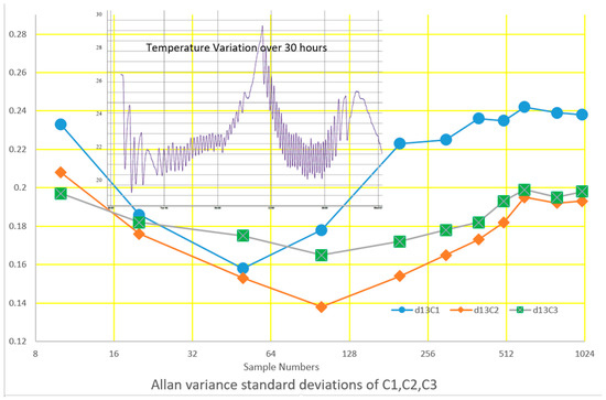 Long term stability of the GC–IR2 system in terms of standard deviations of the three species’ carbon isotope ratios when the laboratory temperature (see insert) varied close to 10 °C.