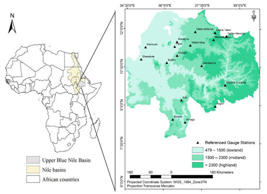 The UBN basin, locally called Abbay in Ethiopian, is located in the northwestern region of the country within 7.5° to 12° N and 34° to 40° E (Figure 1). The basin contributes a large share of water to the main Nile (above 60% of the Nile total flow) and covers a total area of 176,000 km2 upstream of the Ethiopia–Sudan border [1]. The geological formations of the basin are dominated by volcanic rock and Precambrian basement rock, and small areas are covered by sedimentary rock [1]. Highlands with rugged mountainous areas in the central and eastern part of the basin and the lowlands in the western part of the basin are the two major topographic features. The altitude in the basin ranges from ~490 m above sea level (a.s.l.) in the lowlands (near the Ethio–Sudan border) and up to ~4300 m a.s.l. in the highlands (central part of Ethiopia). The dominant soil types in the UBN are leptosols, alisols, nitosols, vertisols, and cambisols [25]. Dry land crop, pastures, savannah, grassland, woodland, water bodies, and sparsely vegetated plants [26,27] dominate the land cover in the UBN.