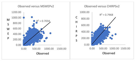 Correlation coefficient (r): The mean value of r across the elevation zones of the UBN were 0.90–0.92 and 0.86–0.88 for CHIRPSv2 and MSWEPv2, respectively. The mean r values of CHIRPSv2 and MSWEPv2 were found to be 0.91 and 0.87, respectively. The value of r did not show a meaningful difference across the highland, midland, and lowland parts of the UBN for CHIRPSv2 and MSWEP v2 products. The mean value of r was nearly equivalent to the perfect score in both CHIRPSv2 and MSWEPv2, that is, the presence of a linear association between the measured and estimated rainfall datasets was observed. However, in relative terms, CHIRPSv2 showed a better performance in the case of UBN. As presented in the scatterplot (Figure 3), the value of R–Squared (R2) was higher in the case of CHIRPSv2. Similarly, the value of CMA and ACMA became 0.6 and 0.71, respectively, for CHIRPS, whereas the values were 0.63 and 0.58 for MSWEP. Accordingly, CHIRPS could be taken as a relatively perfect model.