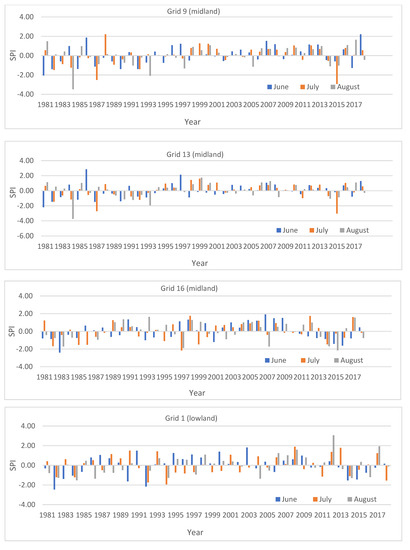 Regarding the computation of the frequency (%) of severe/extreme meteorological drought by month for the selected grids/places in the UBN basin, the ratio of the observed number of severe/extreme meteorological drought months to the total number of years considered for the analysis was calculated (Table 6). Here, the total number of years considered for drought analysis in the basin was 38 years, 1981–2018. Regarding the monthly analysis result, a varied frequency of severe/extreme drought was observed in different parts of the basin for the 38 years. The frequency (%) of severe/extreme meteorological drought over the selected grids/sites for the months of June, July, and August were 0–13.5, 5.4–16.2, and 2.5–13.5, respectively (Table 6). The widest frequency range occurred in the month of June, which is the onset time of the rainy season.