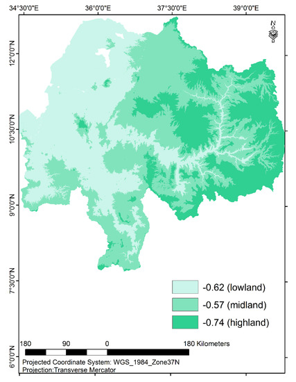 The magnitude (SPI) of monthly meteorological drought over the entire UBN basin from 1981–2018 ranged from 0 to −3.74. The highest SPI (−3.74) was observed in August 1984 over the midland, in the southern part of the UBN (Figure 5). In 2014–2017, the highest magnitude of drought was −3.0 in July 2015 over the highland and −3.03 over the lowland in June 2015. The highest SPI value in the last six years was also found to be −3.03 over the midland, recorded in July 2015 over the southern part of the UBN. Over the 38-year period, severe/extreme drought occurred at the onset and/or offset time of rainy season over all elevation zones of the basin. The result implies the presence of varied levels of exposure to meteorological drought in different elevation zones of the UBN. According to the guidelines described by the authors of [33], the observed magnitude of meteorological drought over the elevation zones of the basin could be characterized by extreme, severe, and moderate levels. The prevalence of moderate, severe, and extreme magnitudes of meteorological drought in the basin was also reported by the authors of [46].