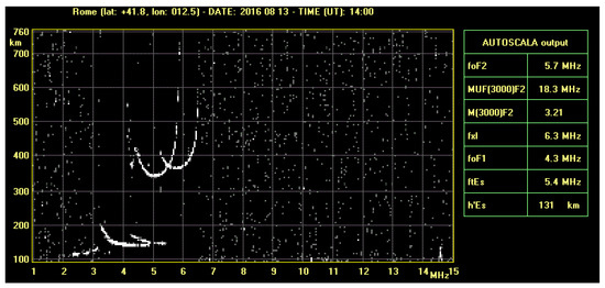 High Es layers were not considered in our analysis, and we have confined ourselves with 10 km ≤ Δh’Es ≤ 40 km deviations as in the previous study [43]. Ionospheric historical data from Rome observatory were used in our analysis. In particular, data from different ionosondes were used for different epochs, i.e., (a) Union Radio Mark II recorded type ionosonde [47] until 1979, (b) Bibl 128P type ionosonde [48] from 1980 to 1995, (c) Barry ionosonde [49] from 1996 to 2004, and (d) Advanced Ionospheric Sounder ionosonde, developed at INGV (AIS-INGV) [50], since 2005. Hourly observations of three parameters, manually scaled from ionograms occurring in geomagnetic quiet conditions (daily Ap < 9 nT and 3-hourly ap index < 12 nT), were considered. For example, the ionogram recorded on 13 August 2016 at 14:00 UT during the ionospheric anomaly associated with the 30 October 2016 EQ (more information to follow) is reported in Figure 1, along with the outputs of the Autoscala software [51,52], developed at INGV. As can be seen, the automatically scaled value of h’Es is more than 10 km higher than the usual 95–120 km range [53].