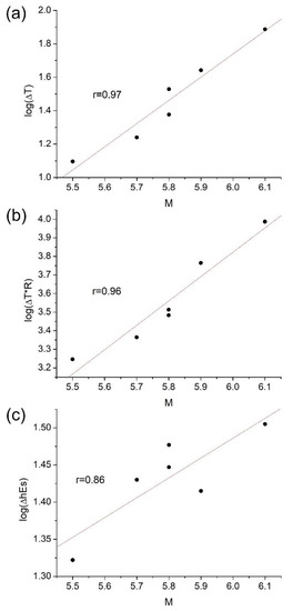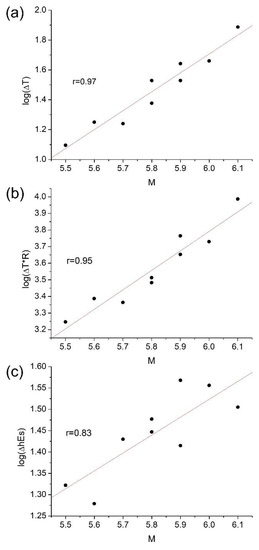 The observed dependencies for (a) log(ΔT), (b) log(ΔT·R), and (c) log(Δh’Es) on the EQ magnitude M. Solid lines—linear regressions. Correlation coefficients, r, are given.