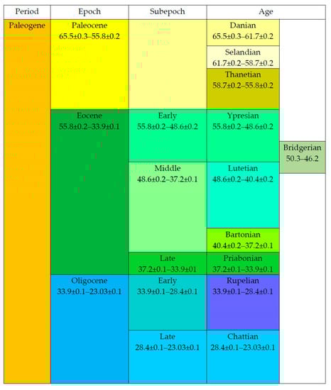 The Paleogene is the first period of the Cenozoic, consisting of three epochs, the Paleocene, Eocene and Oligocene (Figure 1). The Paleogene started at about 66 Ma and ended around 23 Ma. The Late Cretaceous preceded it. The Miocene (from the Neogene) began after the Paleogene. The Paleocene consists of three ages (Danian, Selandian and Thanetian). The Eocene is subdivided into three subepochs (Early, Middle and Late) with four ages (Ypresian, Lutetian, Bartonian and Priabonian). The Bridgerian stands out for the North American Provincial Ages at the end of the Ypresian and the beginning of the Lutetian. This age corresponds with the Green River Formation. The Oligocene consists of two subepochs (Early and Late) and two ages (Rupelian and Chattian).