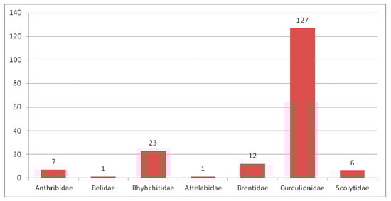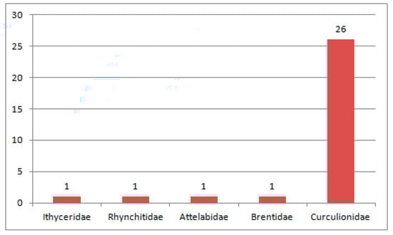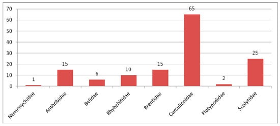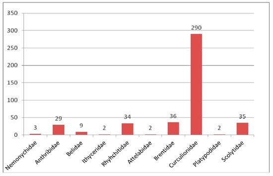 Four species of the family Nemonychidae, 33 species of the family Anthribidae, three species of the family Ithyceridae, nine species of the family Belidae, 41 species of the family Rhynchitidae, three species of the family Attelabidae, 47 species of the family Brentidae, 384 species of the family Curculionidae, two species of the family Platypodidae and 37 species of the family Scolytidae were described from the Paleogene (Table 2).