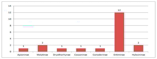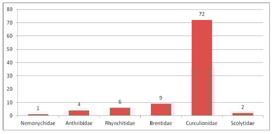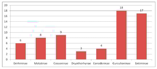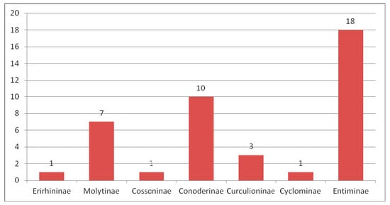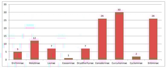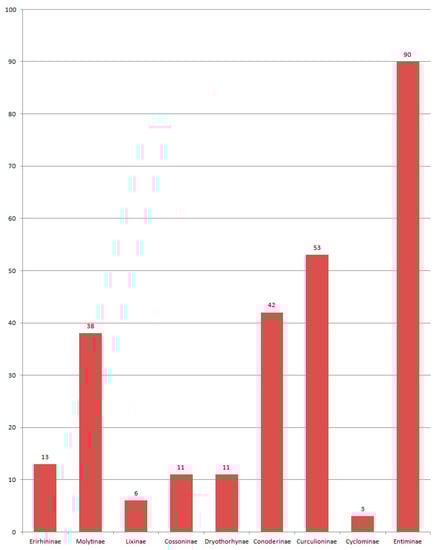 The Curculionidae is the main group of Eocene Curculionoidea numbering 290 described species. All known subfamilies (Erirhininae, Molytinae, Lixinae, Dryophthorinae, Cossoninae, Conoderinae, Curculioninae, Cyclominae and Entiminae) are represented in the Eocene (Figure 5).