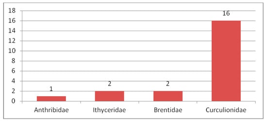 As many as 441 species of weevil-shaped beetles were described from Eocene deposits (Figure 4), which originated from 24 localities. Undescribed forms are known from Quilchena (Canada) [185], Romanian amber [186], Huitrera Formation (Argentina) [187] and Bitterfeld amber.