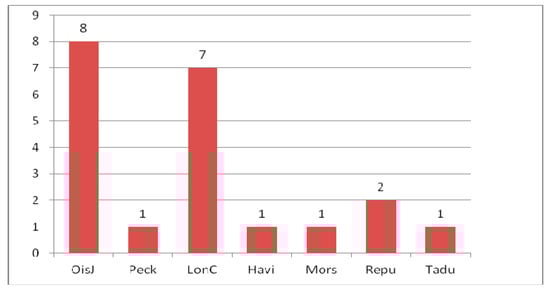 Early Eocene (Ypresian) localities (Figure 6) are in the USA, England (Peckham, London Clay), France (Oise amber), Denmark (Mors), Germany (Havighorst) and the south of the Russian Far East (Tadushi). Twenty one species of Curculionoidea were described from these localities (Figure 7). The families Anthribidae, Ithyceridae, Brentidae, Curculionidae and Scolytidae were recorded for Oise amber [190] from the early Eocene. Unfortunately, the fauna of Oise amber and the London clays include only 7–8 described species, with 1–2 species known (Figure 8) from other localities. The USA contains representatives of the subfamily Ithycerinae now living in North America and has a fundamentally different biota from the rest of the Eocene faunas. Common species and genera intermediate between the early Eocene faunas are absent. Representatives of the tribes Oiserhinini, Palaeotanaini, Sciabregmini, Cryptorhynchini, Dryophthorini, Conoderini, Acalyptini, Eudiagogini are found in Oise amber, Ceutorhynchini in Peckham, Curculionini in Havighorst, Erirhinini, Camptorhinini and Cryptorhynchini in London Clay, Molytini in Mors and Tanaini in Tadushi. Here are found some of the earliest records of representatives of the tribes Sciabregmini (53.0 Ma), Cryptorhynchini (54.0–50.0 Ma), Dryophthorini (53.0 Ma), Eudiagogini (53.0 Ma), Ceutorhynchini and Camptorhinini (54.0–50.0 Ma) and the latest find of the tribe Tanaini in the fossil record. The tribes Oiserhinini, Palaeotanaini, Conoderini and Acalyptini are noted only in the early Eocene. The Oise amber fauna is the most diverse in taxonomic composition and includes four families Anthribidae, Brentidae, Curculionidae and Scolytidae. Only Curculionidae were described from Peckham, London Clay, Havighorst and Mors.