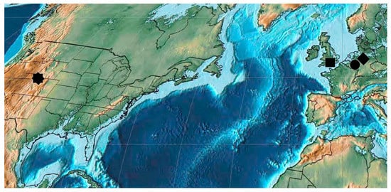 Lutetian Curculionoidea deposits: octagon—Roan Mountain and Green River; square—Corfe and Bournemouth; circle—Messel and Eckfelder Maar, rhombus—Geiseltal.