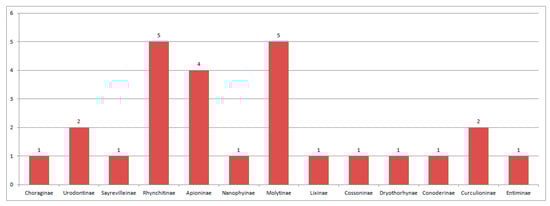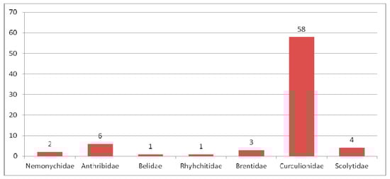 The systematics of the superfamily Curculionoidea is currently not stable [24,25,26,27,28,29,30]. Previously, it included the Mesozoic family Obrieniidae, the systematic position of which is assumed to be related to the Curculionoidea [31] or considered as a family within the Archostemata [32] or a separate superfamily within the Curculioniformia [30,33] and is not considered in this paper. The number of families, groups related to these families and their taxonomic status are not universally accepted [24,25,26,27,28,29,30,34,35,36]. Also the families Nemonychidae, Anthribidae, Belidae, Ithyceridae, Brentidae, Curculionidae, Platypodidae and Scolytidae not universally accepted. In this work the higher classification proposed by the author [29,30,37,38,39,40,41,42] is adopted. The subfamily Cimberidinae is considered part of the family Nemonychidae [26,29,37,38,43], in contrast to the opinion of Seunggwan et al. [44]. The families Anthribidae and Belidae are accepted in the traditional composition [25,27,29,30,32,38,45]. Ithyceridae and Caridae are often regarded as unrelated groups [25,26,27,28,32,36,44]; however, the author considers the family Ithyceridae (incl. Caridae and Ulyanidae) as a diverse, predominantly extinct group, including five fossil (Mongolocarinae, Baissorhynchinae, Montsecanomalinae, Ulyaninae, Slonikinae) and three recent subfamilies (Carinae, Chilecarinae, Ithycerinae) [29,30,38,46,47,48,49,50,51]. Rhynchitidae and Attelabidae are considered as independent families [30,38,52,53,54,55,56,57,58,59,60,61]. The family Brentidae consists of six subfamilies [38]. Nanophyinae and Apioninae, sometimes considered as separate families [26,62,63,64], are included in Brentidae [25,27,30,32,36,38]. The family Curculionidae includes Erirhininae according to Zherikhin and Egorov [65] and Legalov [30,41]. Scolytidae and Platypodidae are considered as separate families [29,30,34,66].