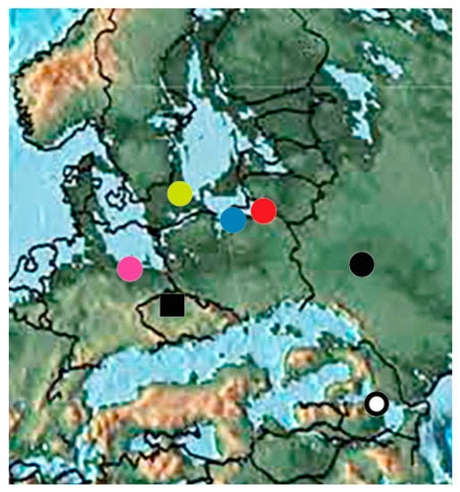 Bartonian Curculionoidea deposits: red circle—Baltic amber (Kaliningrad region); blue circle—Polish amber; yellow circle—Scandinavian amber; pink circle—Bitterfeld amber; ring—Romanian amber; circle—Rovno amber; square—Kutschlin.