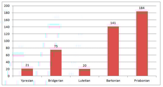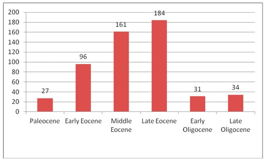 The ages of fossil deposits used are from the website Fossilworks—http://fossilworks.org and some publications [2,3,4,5,6,7,8,9,10,11,12,13,14,15,16,17,18,19,20,21]. Baltic amber from the Prussian Formation ranges from 33–48 million years (Lutetian-Bartonian) [22] and in this work the Bartonian age is accepted [23].