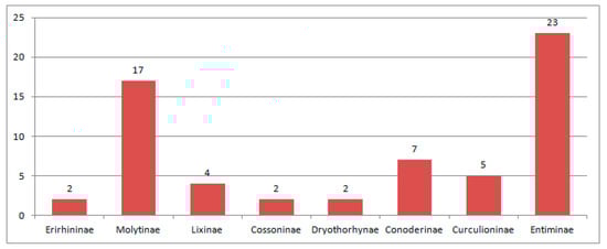 - Lyal, C.H.C. 3.7.7. Molytinae Schoenherr 1823. In Handbook of Zoology. Arthropoda: Insecta. Coleoptera, Beetles; Volume 3: Morphology and Systematics (Phytophaga); Kristensen, N.P., Beutel, R.G., Eds.; Walter de Gruyter: Berlin, Germany; New York, NY, USA, 2014; Volume 3, pp. 529–569. [Google Scholar]