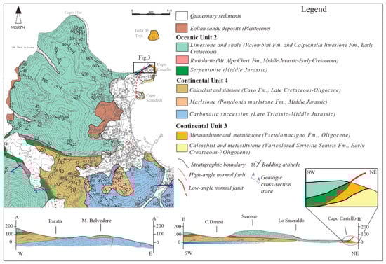 (a) Geological sketch map of Elba Island showing the seven tectonic units belonging to the collisional tectonic pile. The black solid square indicates the study area, enlarged Figure 2; (b) Tectono-stratigraphic columns in the study area: Oceanic Unit 2: S = ophiolite; J = radiolarite (Mt. AlpeChert Fm.); Cl = calcilutite and cherty limestone (Nisportino Fm.); L = cherty limestone (Calpionella Limestone Fm.); LC = limestone and shale (Palombini Shale Fm.). Continental Unit 4: Ev = evaporite (Calcare Cavernoso Fm.); M = massive and cherty limestone and dolostone (Pania di Corfino Fm., Mt. Cetona Fm., Calcare Massiccio Fm., Grotta Giusti Limestone, Rosso Ammonitico Fm., Limano cherty Limestone Fm.); Mp = marls (Posidonia Marlstone Fm.); Ml = Varicolored Shales (Cavo Fm.). Continental Unit3: Bphy = black phyllite (Rio Marina Fm.); Q = quartzite and phyllite (Verruca Fm., Mt. Serra quartzite Fm.); M = marble (Valle Giove Limestone Fm.; Capo Pero Limestone Fm.; Capo Castello Calcschist Fm.); Mc = cherty marble; Cs = calcschist and phyllite (Varicoloured Sericitic Schist Fm.); Ms = metasandstone and phyllite (Pseudomacigno Fm.) Modified, after [32,33].