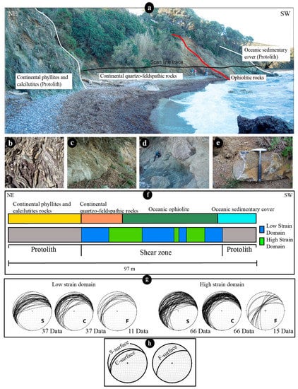 Capo Castello analyzed shear zone involving the quartzo-feldspathic rocks belonging to the Continental Unit 3 and the ophiolite-bearing rocks, with their sedimentary cover, belonging the Oceanic Unit 2. (a) Panoramic view of the study area with the boundary between different rock formations involved in the faulting and the scan line trace in black; (b) Protolith (i.e., the rock undeformed by the study shear zone) of calcschist and phyllite characterized by isoclinal folds; (c) metasandstones involved in the shear zone; (d) serpentinite level in the shear zone; (e) protolith with limestone and shale, structurally located over the serpentinite; (f) scan-line showing the lithology, and the distribution of the strain domains; (g) Structural data (lower hemisphere, Schmidt diagram) of the low and high strain domains. Stereoplots indicate cyclographic traces of C and S surfaces and of the brittle west-dipping structures F see the text for description; (h) Average stereoplots showing top-to-the ESE shear sense (to the right) and west dipping brittle structures (to the left).Structural and kinematic data are plotted in stereographic diagrams, lower hemisphere, equiareal projection. Stereograms were obtained by OSX Stereonet, from: http://www.geo.cornell.edu/geology/faculty/RWA/RWA.html.