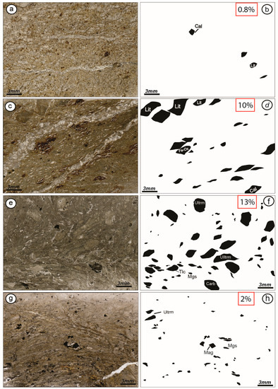 Area percentage occupied by porphyroclasts, as computed using image analysis. (a,b) quartzo-feldspathic protomylonite domain; (c,d) quartzo-feldspathic mylonitic domain; (e,f) myloniticserpentinite; (g,h) ultramylonite in serpentinite level. Srp: serpentine; Lit: lithic clast; Carb: carbonate clast; Mag: magnetite; Mgs: magnesite; Tlc: talc; Ultrm: ultramafic clast.