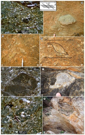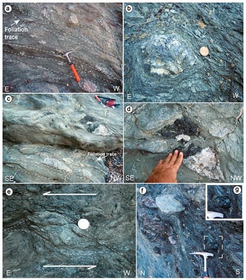 Mylonitic domain in serpentinite rocks. (a–c) well expressed schistosity, in crystallized matrix with large porphyroclasts (predominantly of carbonate composition), aligned along the main foliation; (d,e) top-to-the-east carbonate and ultramafic porhyroclasts; (f) top-to-the-east δ-type ultramafic (enlarged in g) and carbonate porphyroclasts.