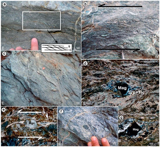 Ultramyloniticserpentinite domain. (a,b) closely spaced top-to-the-east S/C and shear bands structures, respectively; (c) highly foliated matrix with tiny porphyroclasts aligned along the main schistosity; (d) Crossed polars micrograph showing an asymmetric magnetite porphyroclast with well evident strain shadow, mainly composed of talc and serpentine and pointing to a top-to-the-east shear sense; (e) crossed polars micrograph showing an asymmetric (top-to-the-east shear sense) magnesiteporphyroclast with a well evident strain shadow, mainly composed of talc; (f) rounded ultramafic porphyroclasts dispersed in a highly foliated matrix; (g) crossed polars micrograph showing an euhedral magnetite porphyroclast with a well-developed strain shadow, mainly composed of talc and serpentine.