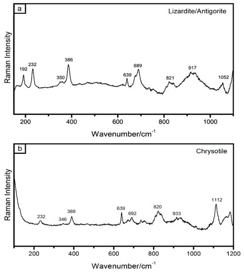 - Rinaudo, C.; Gastaldi, D.; Belluso, E. Characterization of chrysotile, antigorite and lizardite by FT-Raman spectroscopy. Can. Mineral. 2003, 41, 883–890. [Google Scholar] [CrossRef]