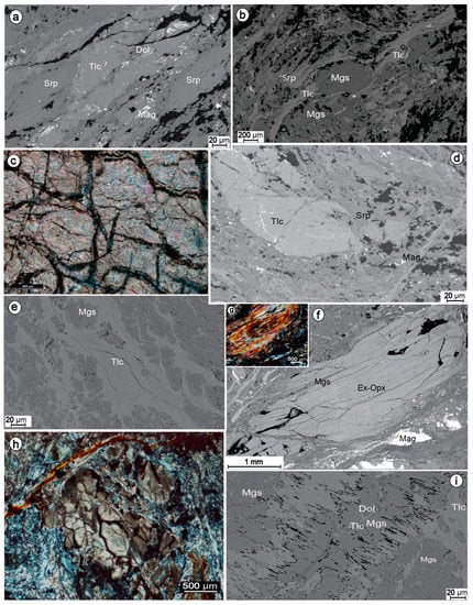 The system opening, then, can bring to other, even coeval, metamorphic reactions, here referred to as (4) [86]. Magnesite, being present both along the foliation and within later veins (Figure 11e,h), can be considered as developing from the initial-to-mature stages of shearing, based on the following reaction:
