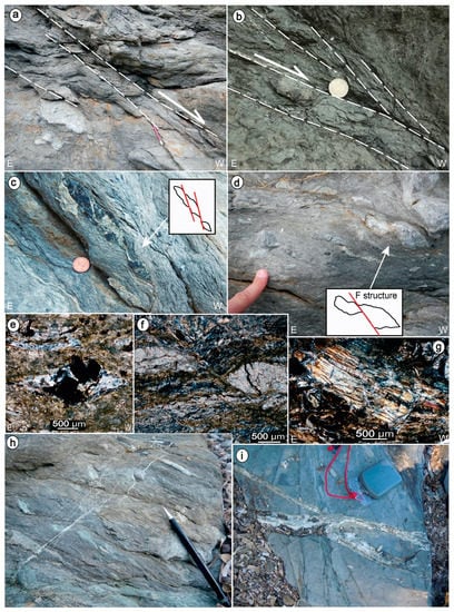 Metasandstonemylonites differ from the protomylonite by the higher proportion of dark grey crystallized matrix and a larger amount of porhyroclasts and foliation intensity. The latter is indicated by an increase in the alignment of micas and by a stretching and flattening of quartz and magnesite crystals. Foliations are here represented by S/C structures, generally making angles of less than 40° (Figure 3g). These, both in oriented thin-sections and at the outcrop scale, show a general top-to-the-ESE sense of shear (Figure 3g,h and Figure 6a).