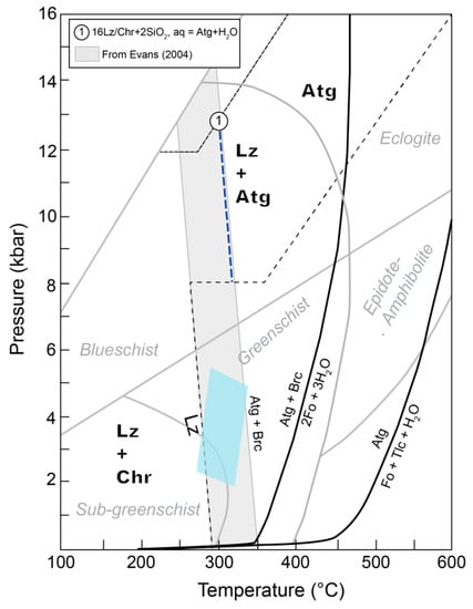 Phase diagram of antigorite and lizardite (from [69], modified). Symbols: Lz-lizardite, Atg-antigorite, Chr-chrysotile, Fo-forsterite, Tlc-talc, Brc-brucite. Reaction (1) is from [68] and occurs in the presence of SiO2-rich fluids by dissolution–precipitation processes. The pale blue area represents the coexisting lizardite and antigorite in the Capo Castello shear zone stability field.