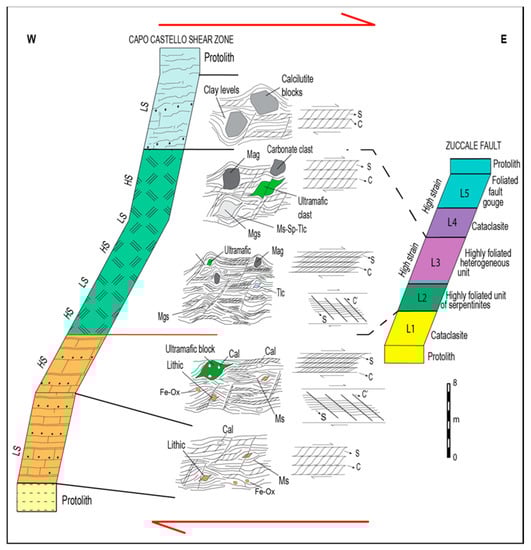 Sketch comparing the Capo Castello shear zone and the Zuccale normal fault stratigraphy. Along the Capo Castello shear zone log, the different strain domains are represented. The Zuccale normal fault log is reconstructed taking into account [56]. L1: cataclasite, locally with protomylonitic basement clasts, in a carbonate-quartz-chlorite matrix; L2: highly foliated unit of serpentinite plus tremolite-talc-chlorite schist; L3: highly heterogeneous unit of chlorite phyllonites with lenses of carbonate mylonite; L4: carbonate vein-rich unit set in a cataclasite with carbonate and ultramafic lenses; L5: foliated fault gouge and fault breccia. Deformation structures and deformation mechanisms of L2–L3 units are similar to the ones of the serpentinite levels in the Capo Castello shear zone.