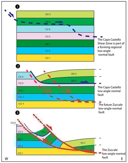 Tectonic scheme, not to scale, showing the tectonic omission, caused by the low angle normal fault to which the Capo Castello shear zone belongs, and its relationship with the low-angle Zuccale normal fault, in the stacked pile. From the top to the bottom: (1) the original Elba Island stacked pile linked to the Late Oligocene–early Miocene collisional phase; (2) the tectonic omission linked to the activity of the low angle normal fault to which the Capo Castello shear zone is associated; the Oceanic Unit 2 is in direct contact with the continental unit 3; (3) the tectonic omission generated by the Zuccale normal fault along which the Oceanic unit 3, the highest unit in the tectonic pile, overlay the deepest continental unit 1. Symbols indicate the Oceanic (OU) and the Continental Units (CU) stacked during the orogenesis. See also Figure 1.