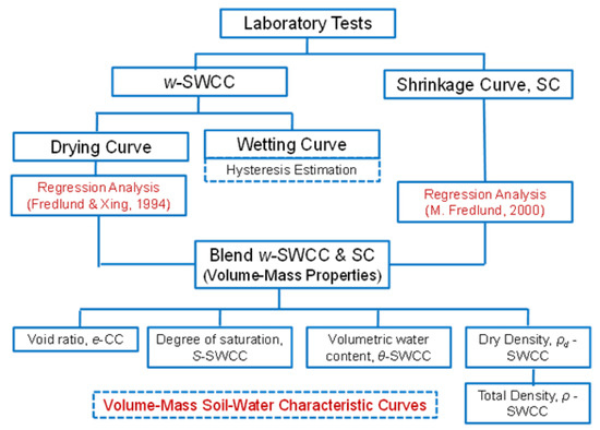 The calculation of unsaturated soil property functions commences with the laboratory measurement of the: (i) desorption (or drying) gravimetric water content versus soil suction data (w-SWCC) and (ii) shrinkage curve data (SC). Figure 1 emphasizes the steps involved in “blending” the w-SWCC and SC laboratory data. The “blending” steps ensures that the analysis of the data starts from a common set of volume-mass soil properties. The w-SWCC and the SC laboratory can then be used to calculate other volume-mass soil property relations, such as (i) void ratio versus soil suction, (ii) degree of saturation versus soil suction, (iii) volumetric water content versus soil suction, and (iv) density versus soil suction.