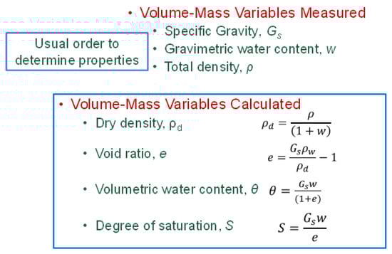 It is assumed that the specific gravity, Gs, has been either independently measured or accurately estimated based on previous experience. When a soil sample is brought into the laboratory, there is a general hierarchy with respect to the measurement of other volume-mass properties. For example, the gravimetric water content, w, and the total density of the soil, ρ, are the first basic measurements to be made. Once these three variables are measured, all other volume-mass variables can be calculated. Figure 2 emphasizes the difference between the measured and calculated volume-mass variables.