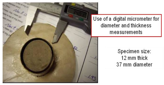 A shrinkage curve test commences with a soil specimen that has been allowed to fully imbibe free water (i.e., to near-saturation conditions). The shrinkage curve test provides data on the relationship between volume change (in terms of changes in the void ratio) and gravimetric water content as the soil suction is increased under evaporative conditions, from near-zero conditions to completely dry conditions [16]. Test specimens for the SC test and the w-SWCC test should be prepared from the “same” soil sample. The SC specimen is commonly about 30 mm in diameter and 10 mm thick, while the w-SWCC specimen is commonly about 70 mm in diameter and 30 mm thick [5,17,18,19] (Figure 4).