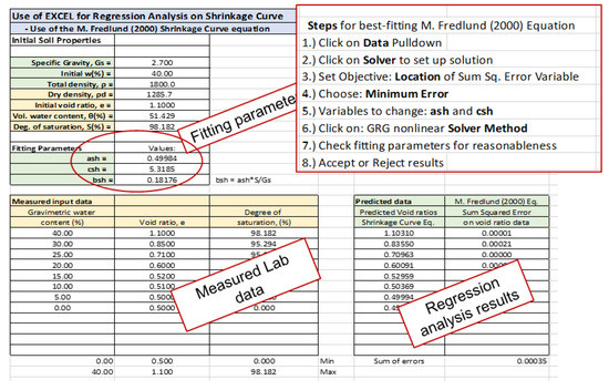 where ash = the minimum void ratio upon complete drying, csh = the variable related to the sharpness of the curvature as the soil desaturates, bsh = the variable related to the slope of the drying curve calculated as bsh = (ash So)/Gs, and So = the initial conditioned degree of saturation. The collected data can be entered into a spreadsheet for analysis purposes. The first function involves the calculation of the various volume-mass properties, followed by a regression analysis that converts the measured data into best-fit parameters (Figure 6).