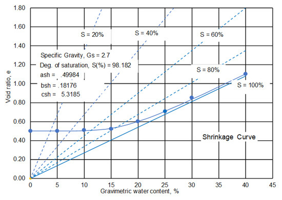M. Fredlund [14] proposed a hyperbolic equation for the best-fitting of measured shrinkage curve data. The shrinkage curve can thus be reduced to two fitting soil parameters, as shown in Equation (1):