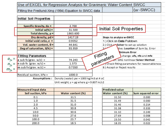 EXCEL spreadsheet used for a regression analysis on the w-SWCC laboratory data.