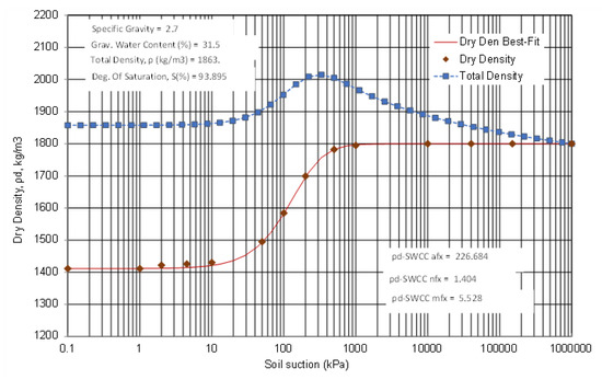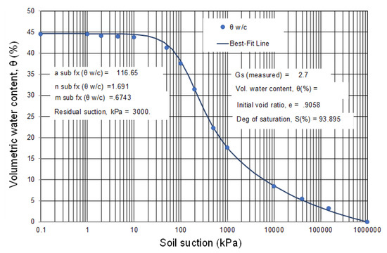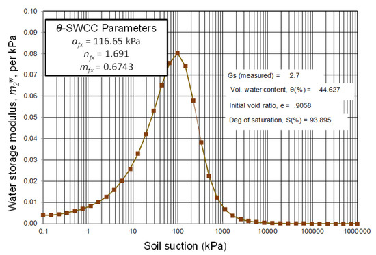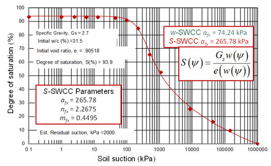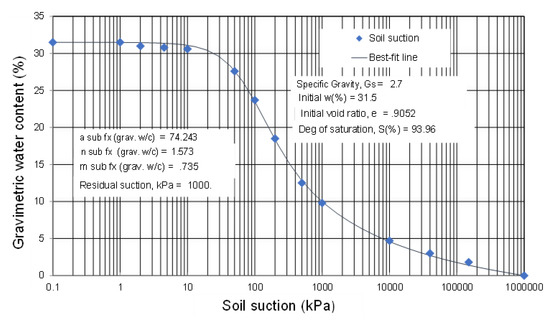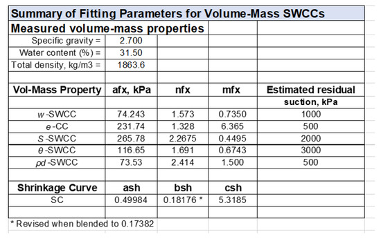 The scope of this paper is limited to the application of the Fredlund and Xing [13] equation for all SWCCs and the M. Fredlund [14] equation for the shrinkage curve. This approach is deliberate in order to remain focused on the goal of illustrating the “estimation methodology” for modeling unsaturated soil mechanic problems. The use of the above-mentioned empirical equations for the SWCC and SC cover the entire range of possible soil suctions. Similar methodologies could be developed using other mathematical equations to represent unsaturated soil properties [15,16].
