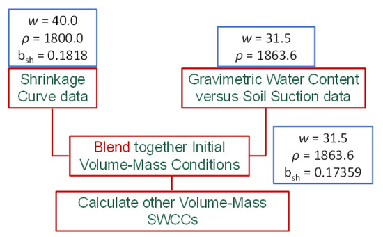 Figure 5 shows the measurements of the shrinkage of a soil specimen as drying occurs from a wet soil specimen. The initial volume-mass properties should be measured on both the SC specimen and the w-SWCC specimen; however, it is later necessary to “blend” the two sets of laboratory results for the calculations of other volume-mass SWCCs.