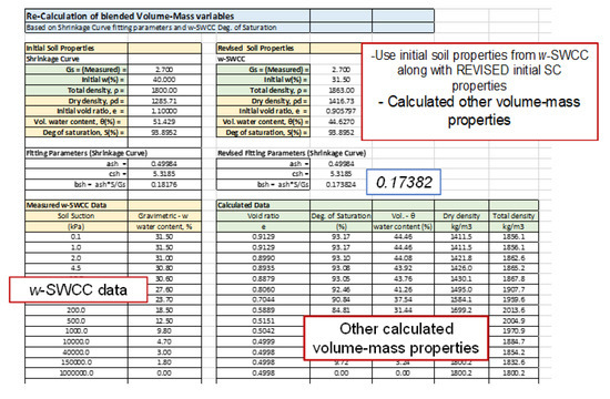 The ash and csh variables remain the same; however, the bsh variable must be changed from 0.1801 to 0.17359 due the change in the starting degree of saturation. The adjustment of the bsh variable means that other volume-mass variables can be calculated corresponding to suction measurements made during the w-SWCC test. Sample calculations for the remaining volume-mass variables are shown in Figure 12.