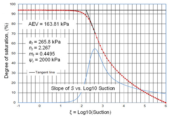 The “true” air-entry value, AEV, corresponds to the intersection point between a horizontal line through the initial degree of saturation and the line of tangency through the inflection point [23]. The inflection point corresponds to the point where the slope of the function is the largest. A line of tangency is drawn through the inflection point in order to calculate the “true” air-entry value. The above numerical solution provides an empirical procedure for the calculation of a unique value for the “true” air-entry value of a soil. Figure 16 shows the determination of a “true” air-entry value, AEV, of 163.81 kPa for the soil. The analysis of the S-SWCC sets the stage for the next steps, which are the estimation of the USPFs (e.g., the coefficient of permeability function) [23].